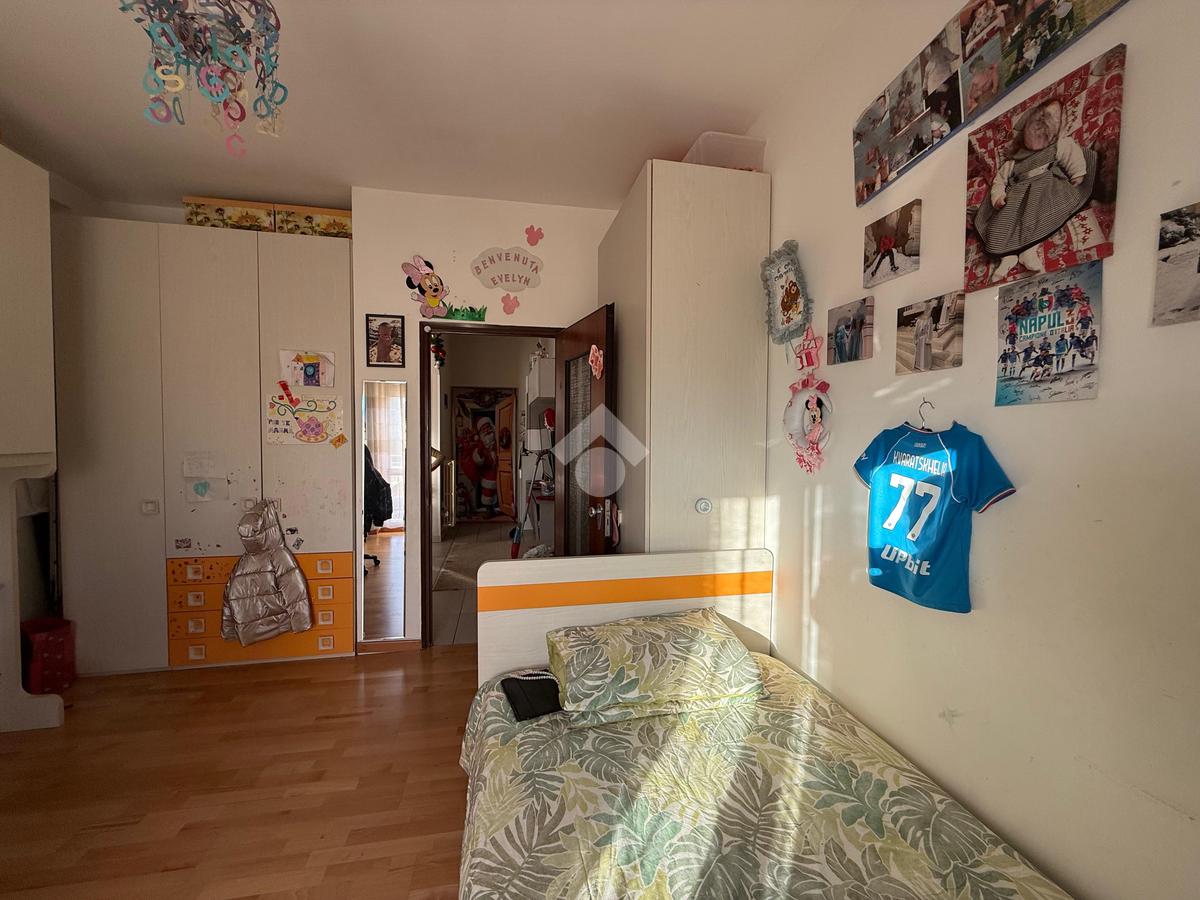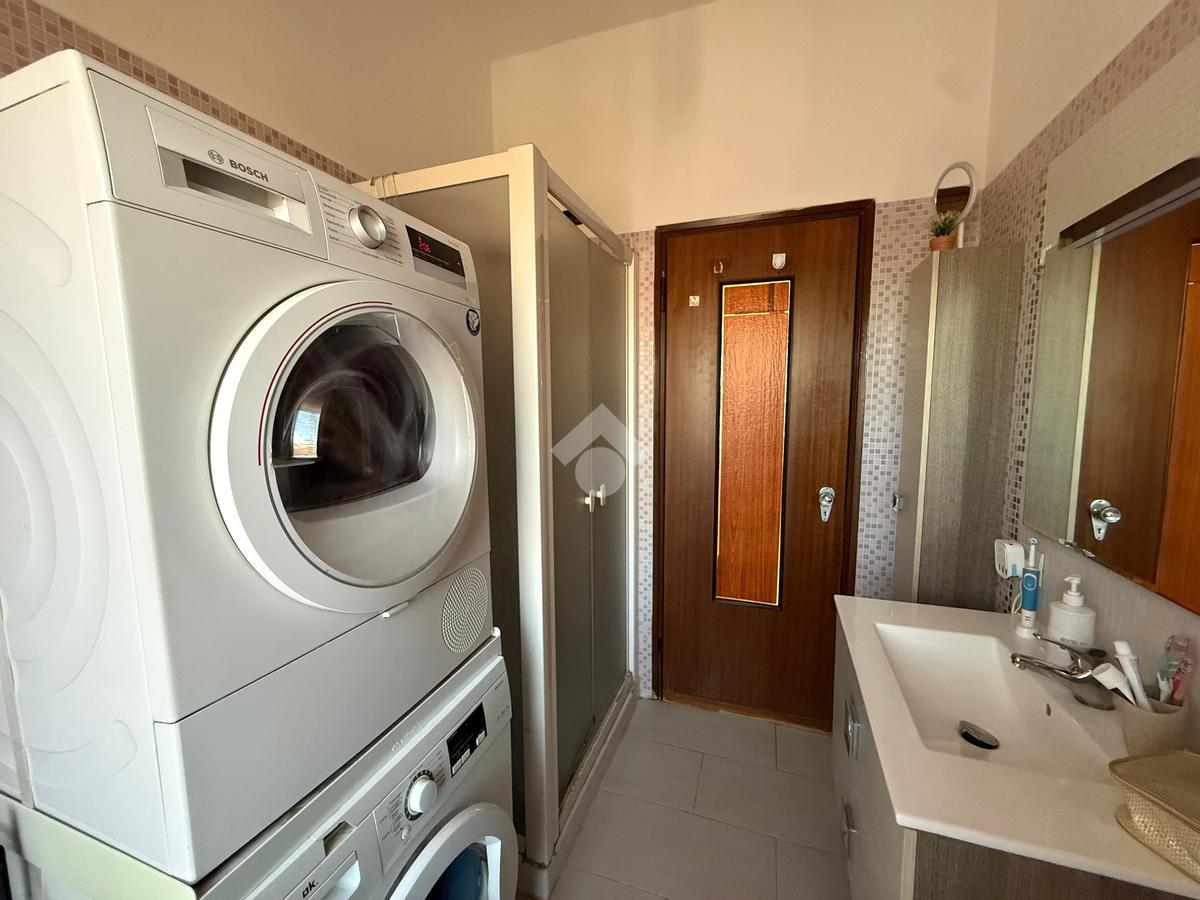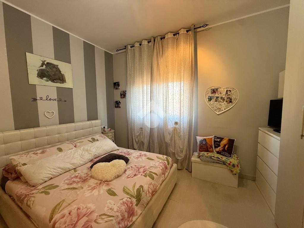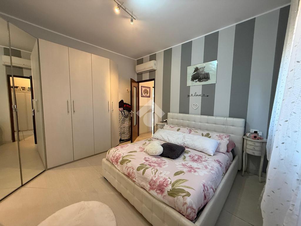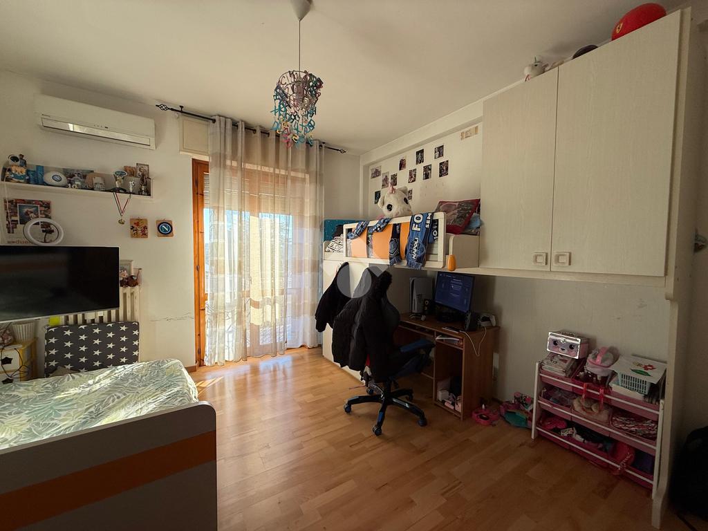 La zona giorno si apre su un balcone a L, accessibile sia dal soggiorno (attualmente adibito a cameretta) che dalla cucina, ideale per momenti di relax all'aperto. Il bagno è ben rifinito e spazioso e anch'esso dotato di balcone. L'immobile è dotato di riscaldamento centralizzato e aria condizionata, assicurando comfort in ogni stagione.