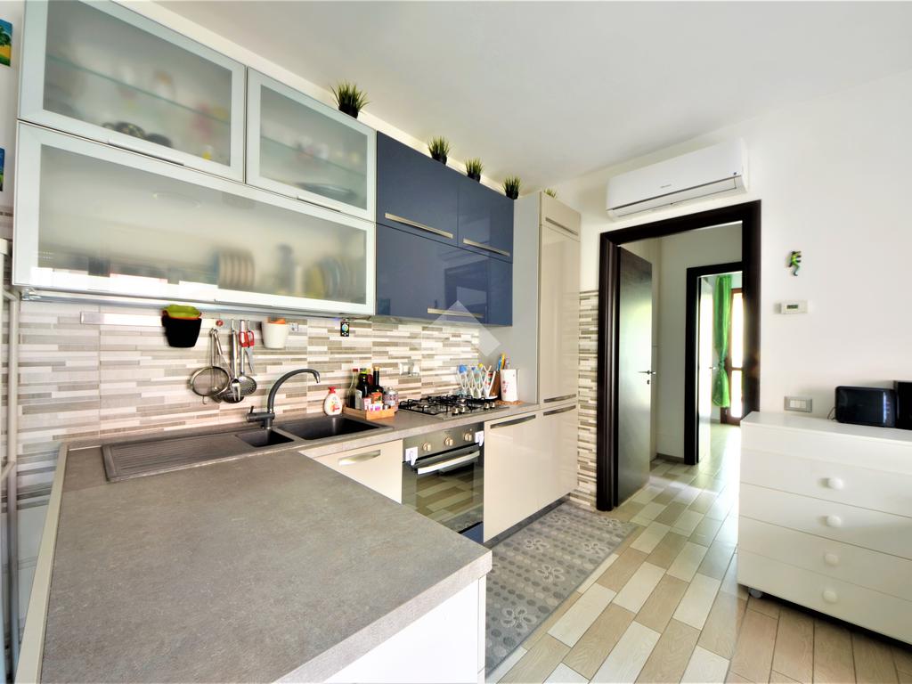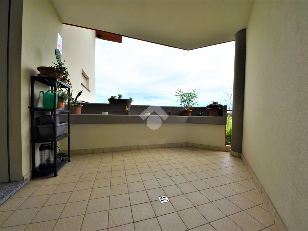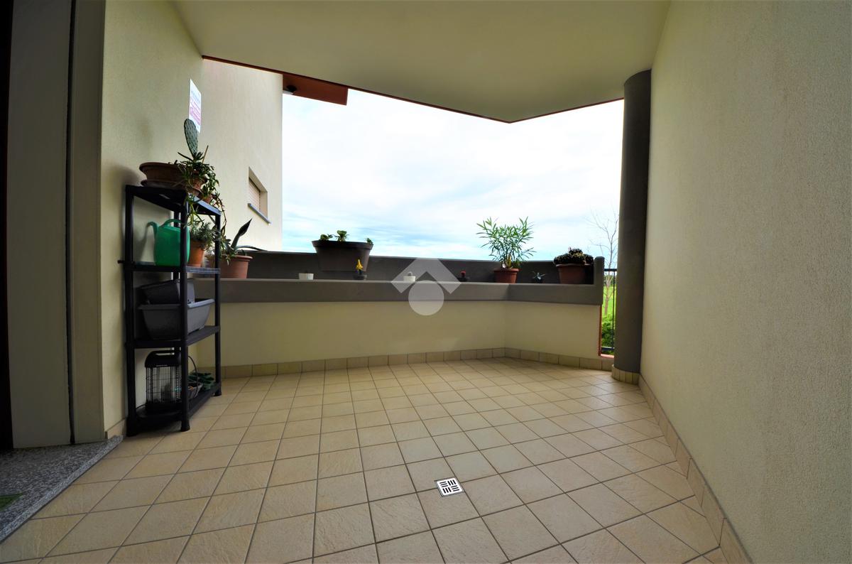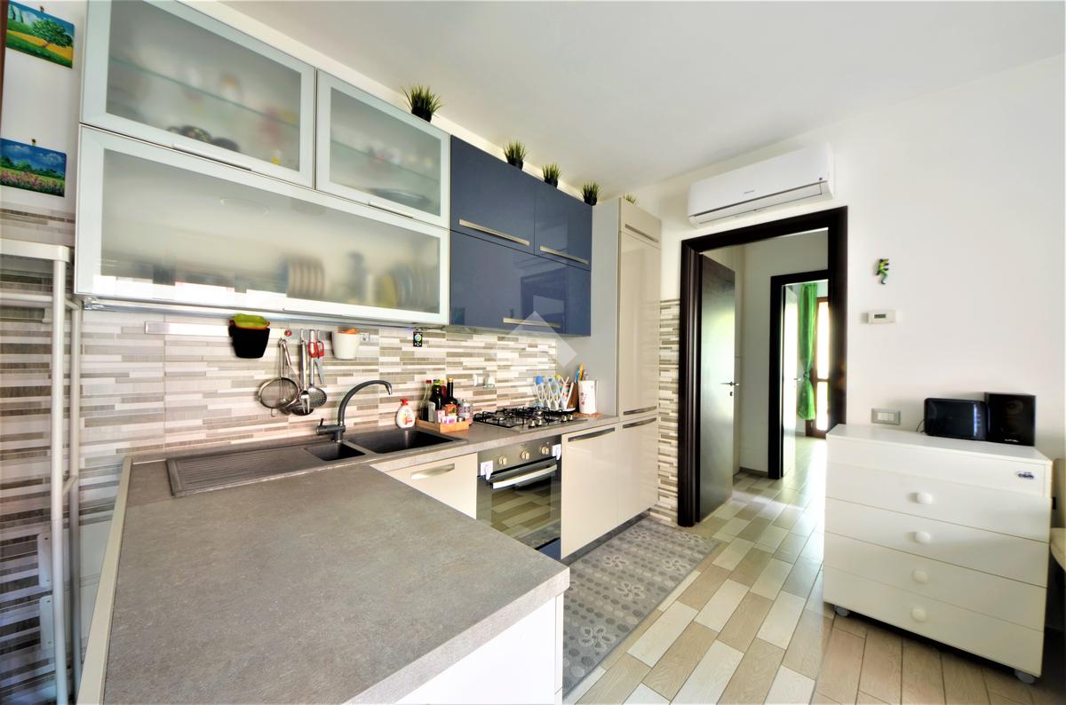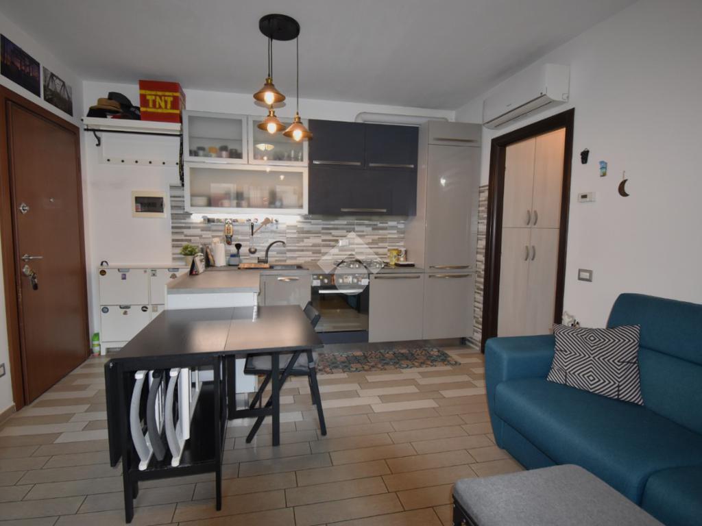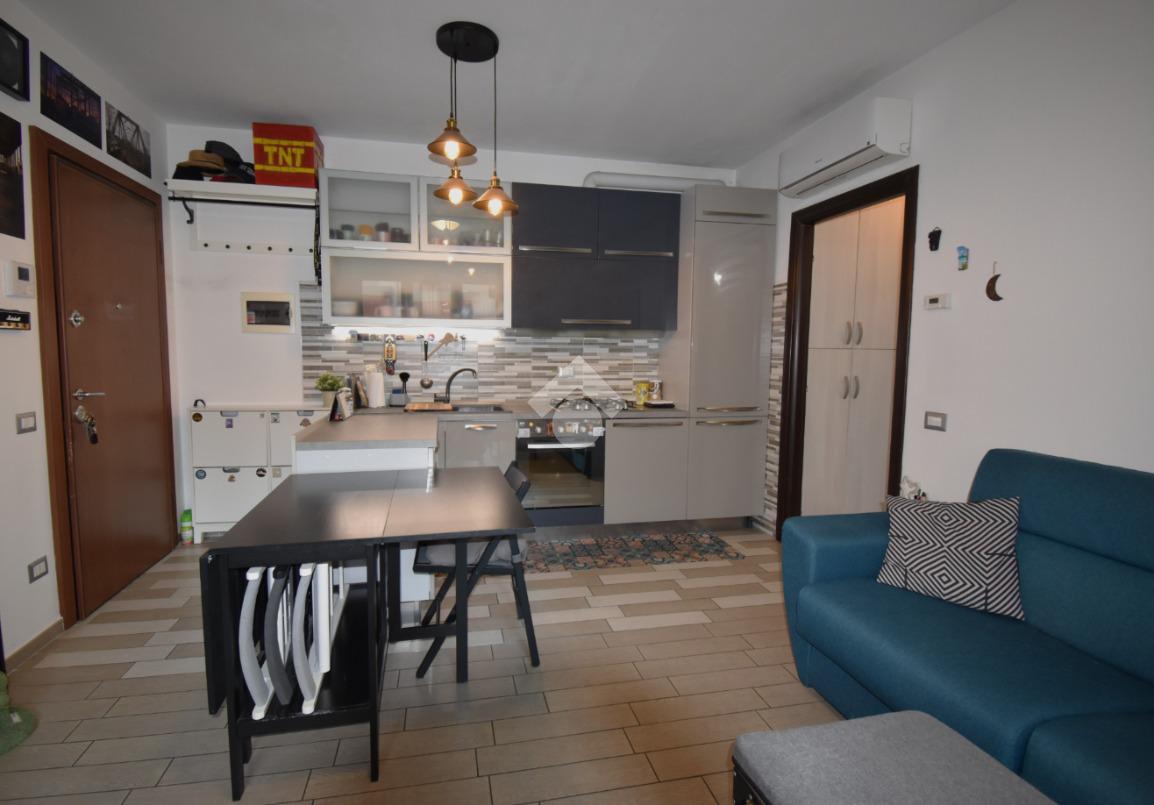 L'appartamento, situato al piano basso di un edificio costruito nel 2014, si estende su una superficie di 62 mq ed è così composto: luminoso soggiorno con cucina a vista e un ampio terrazzo, disimpegno con accesso al bagno completo e alla camera da letto, anch'essa servita da un bel terrazzo con vista aperta. L'immobile è dotato di aria condizionata, garantendo un ambiente fresco durante i mesi estivi. Completano la proprietà una cantina e un box auto.